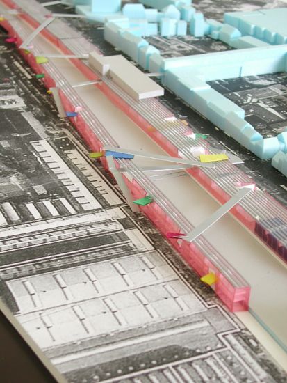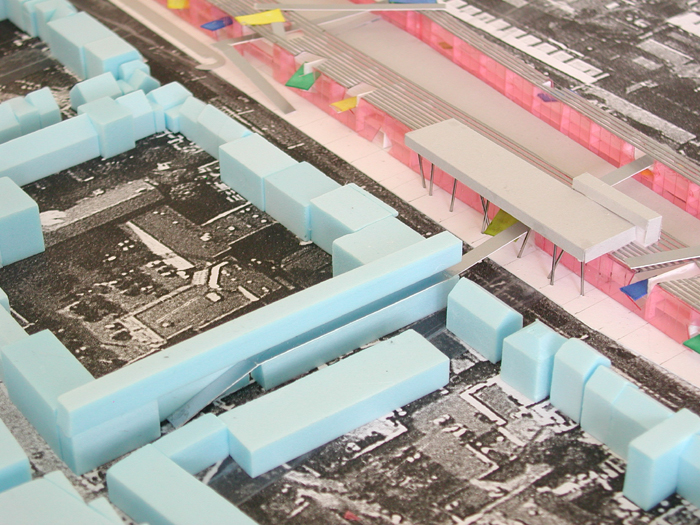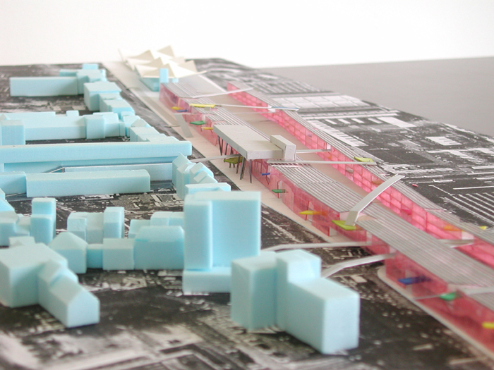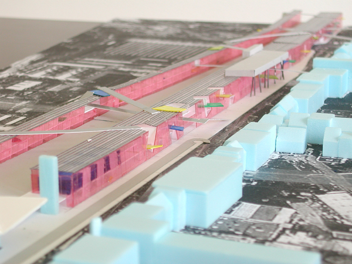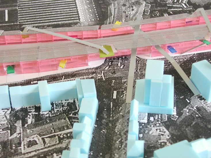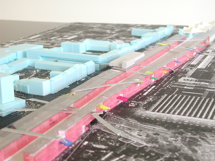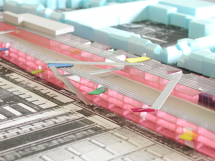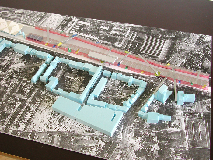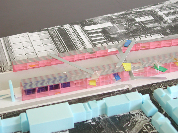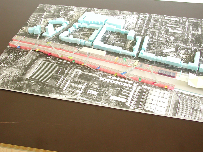 Daartoe stellen wij voor ter weerszijden van het “hoogspoor” lange transparante hallen met een open structuur te situeren. Beiden 3 bouwlagen hoog, ca 13 meter. De hallen lopen vanaf de klokkentoren (wasknijper) tot aan de Clippergarage.