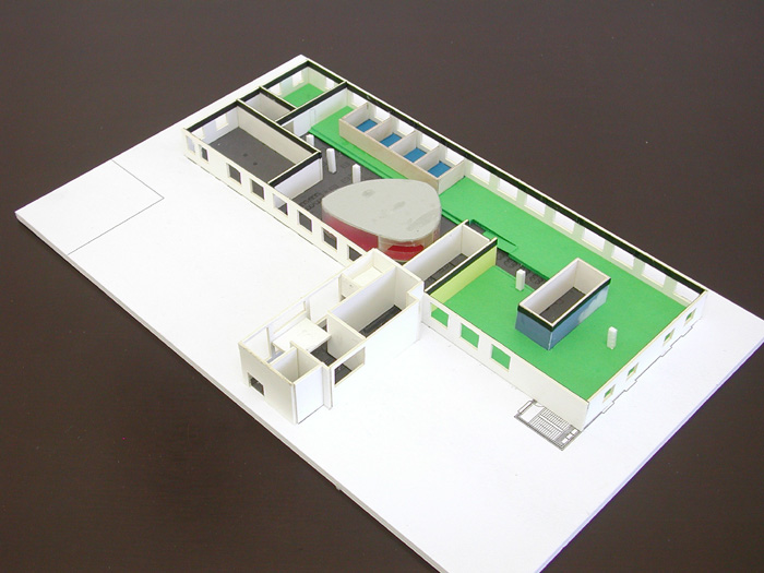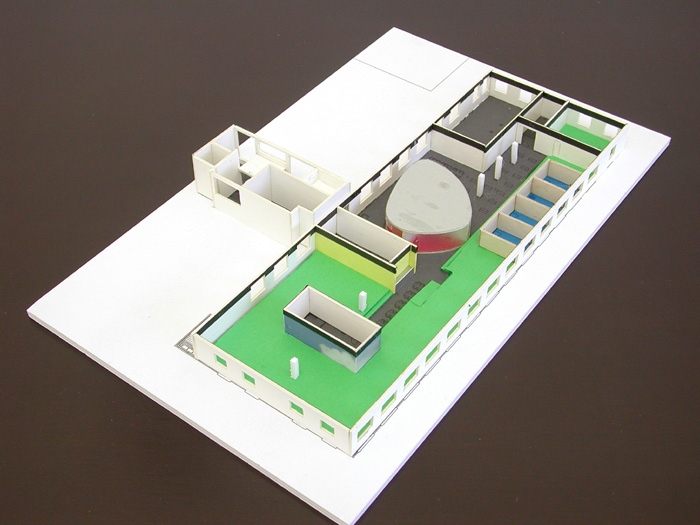 De inrichting van het kantoor is zodanig ontworpen dat nagenoeg niets meer herinnert aan de oude situatie. De kantoorruimte is vorm gegeven als een open ruimte waarin een aantal te onderscheiden objecten zijn opgenomen. In deze objecten zijn werkplekken en ruimten gesitueerd die een zekere beslotenheid dicteerden. Tussen de objecten onderling zijn werkplekken en voorzieningen geprojecteerd die in minder afgesloten ruimten kunnen functioneren. De hoogte van de borstwering is voor een groot gedeelte verminderd door plaatselijk de vloer te verhogen. Hierbij wordt er van uitgegaan dat de bestaande radiatoren zo mogelijk onveranderd op dezelfde positie en hoogte blijven. Daar waar het vloerniveau niet wordt verhoogd zijn de voorzieningen voor het zo genaamde middengebied opgenomen alsook de repertoireruimte. Een aantal bestaande wanden zijn gehandhaafd, doch niet meer als zodanig herkenbaar door hun vernieuwde afwerking.