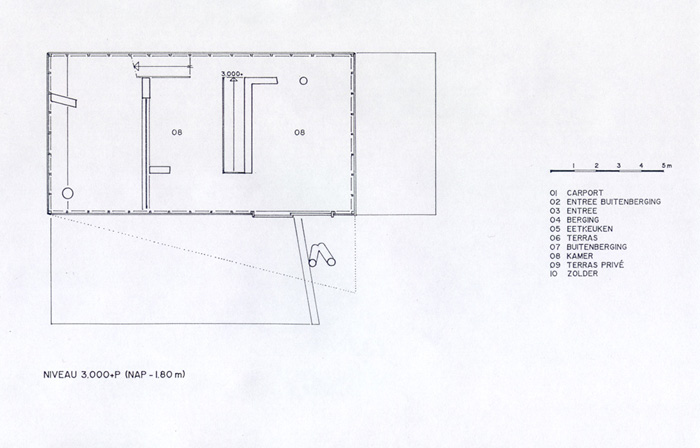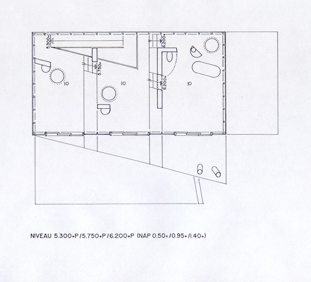 De open structuur in de woning wordt verkregen door de ruimten onderling te scheiden door horizontale vloervelden en vrijstaande, verticaal dragende elementen en te verbinden door vides. Deze open structuur wordt door de routing in het gebouw en de confrontatie met de verschillende ruimten extra benadrukt.