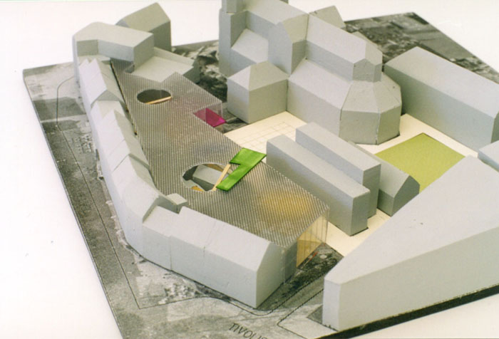 Het plan, een open serreachtige aanbouw, biedt ruimte aan een collectieve horecavoorziening, te vergelijken met de buitenterrassen in de zomermaanden. De hoogte van de serre wordt bepaald door de onderkant van de dakgoot van de bestaande hoofdbebouwingen. Dankzij deze hoogte ontstaan op de daken van de te handhaven aanbouwen te benutten binnenruimten. Tevens zijn in de serre op diverse niveaus vloervlakken, vrije van vorm, opgenomen. Het dak van de serre wordt op sommige plekken onderbroken ten behoeve van dakterrassen en bomen.