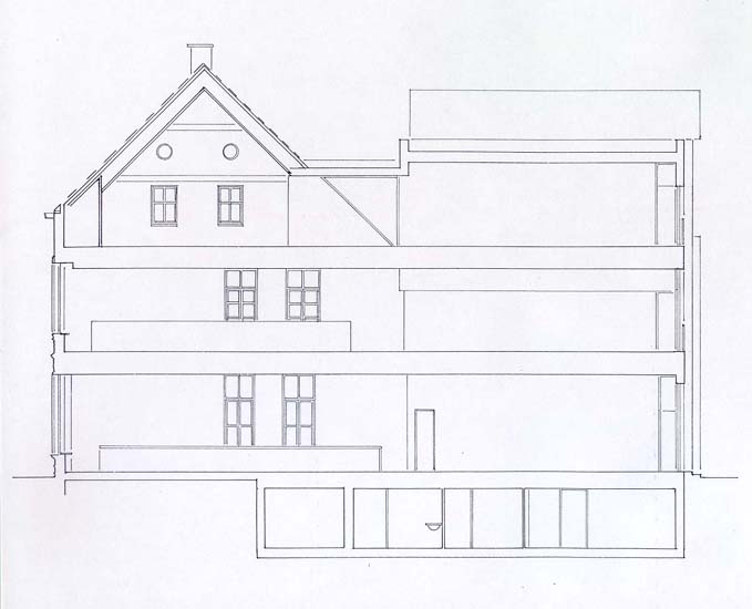De gevels van het achterste herenhuis zijn voorzien van wit stukwerk, terwijl de iroko kozijnen behandeld zijn met een transparante lak. Dit gestukte herenhuis is geplaatst tegen de gemetselde gevel van het Tilburgse steegje, de Damsstraat, welke wel voor wat betreft de hoogte en materialisatie maar niet voor wat betreft de indeling refereert aan de oude gevel. Op de eerste verdieping is aan de zijde van het parkje over de gehele breedte van het pand een balkon aangebracht.