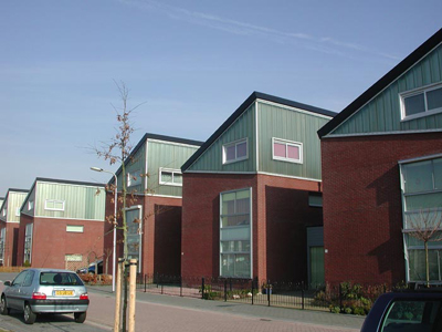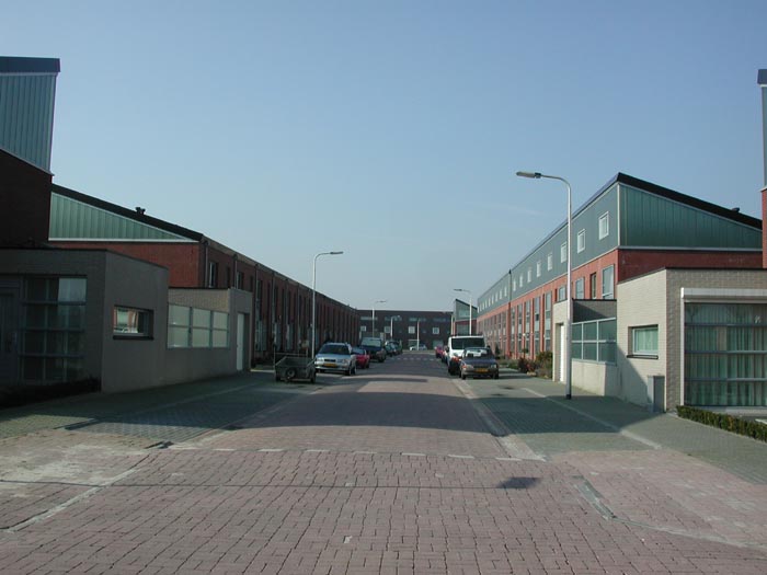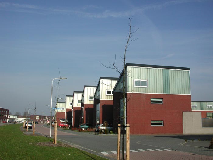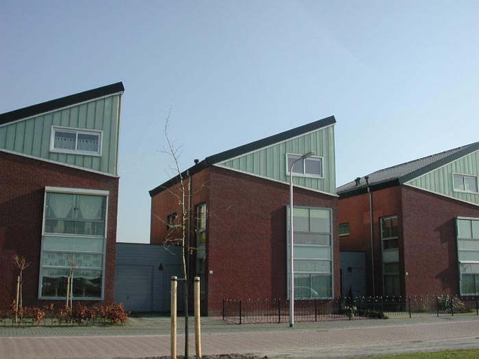 Alle woningen dan wel woningrijen bestaan uit een gemetselde onderbouw van twee bouwlagen hoog voorzien van een lessenaarskap. Doordat alle kappen met de hoge kant op het zuiden dan wel op het westen zijn georiënteerd wordt een levendig straatbeeld verkregen: aan de noordkant ‘hoge’ en aan de zuidkant ‘lage’ woningen.