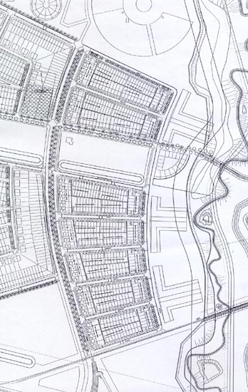 Het daartussen liggend gebied bestaat uit voornamelijk oost-west georiënteerde bouwblokken.