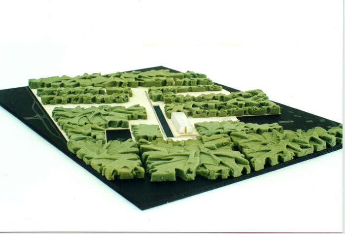 Om in dit landschap van coulissen gebouwen te plaatsen die zowel het landschap als de herpetologische waarden zo min mogelijk aantasten worden evenwijdig aan de doorsnijdingen eenduidige structurerende elementen geprojecteerd.