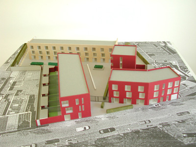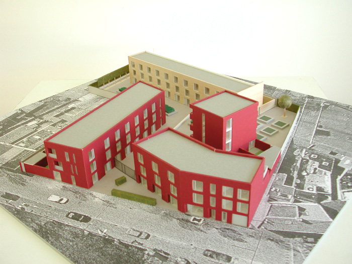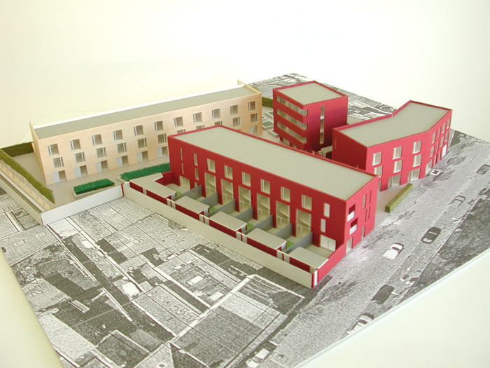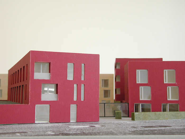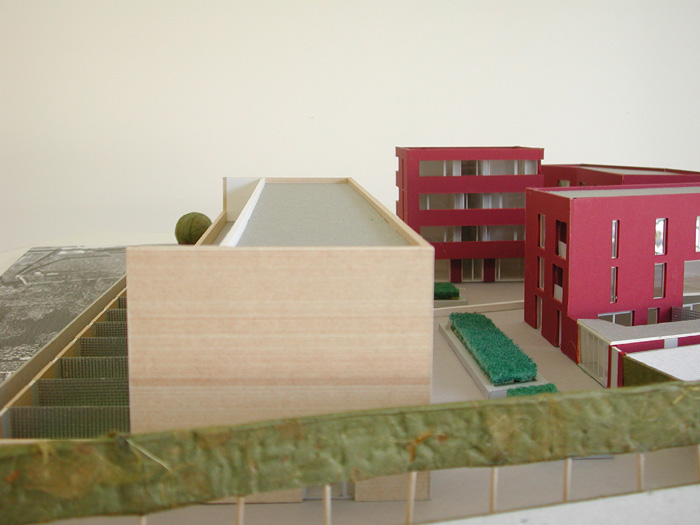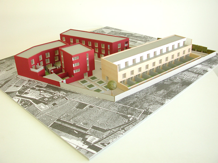 Het plan is ontworpen als een verzameling ongelijke bouwblokken die deels, via de gemetselde tuinmuren, met elkaar verbonden zijn. Deze bouwblokken zijn allen uitgevoerd in metselwerk, rood genuanceerd. Een uitzondering hierop vormt het langgerekte bouwblok op het achterterrein. Door dit los te houden van de overige bebouwing wordt de openheid en transparantie van het gebied gewaarborgd. De uitvoering ervan in geel genuanceerd metselwerk versterkt dit effect.
