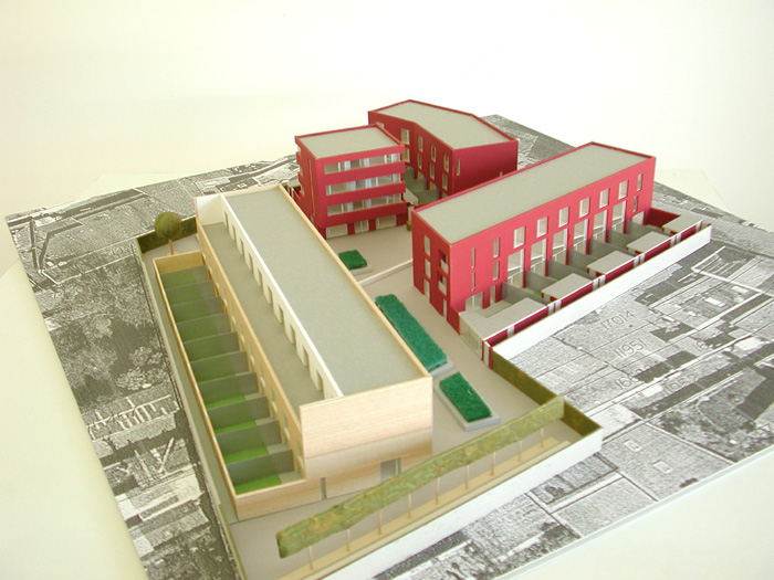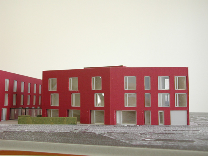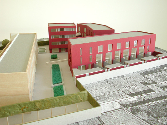 Het laatste bouwblok biedt ruimte aan 4 grondgebonden woningen en een bovenwoning met dakterras boven de poort naar de parkeerkelder.